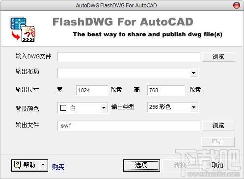 FlashDWG可将CAD文件转换为SWF文件,客户不必安装CAD就可观看DWG图形全貌,软件允许设置输出文件的背景颜色和尺寸大小。