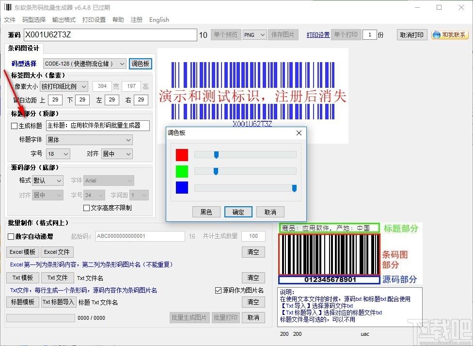 5、通过滑动调色板三色滑块可以设置条码颜色