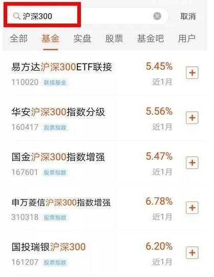 三、接着我们就来看一下如何买,点击搜索基金,小编这里以“沪深300”为例,可以发现会出现多个选项,大家可以按需挑选一个进入。