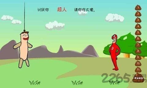 这是一款纯恶搞的游戏。超人将用11种不同的方式将自己的排泄物抛向对面的被吊起的小布偶身上。游戏的关键处在于,你就是那个神通广大所向无敌的超人。